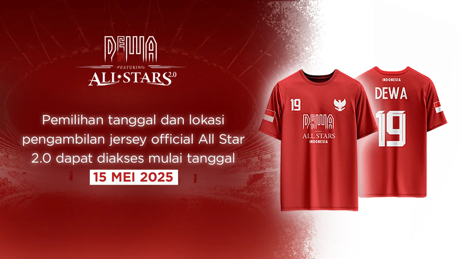 - Jersey Official All Stars 2.0 dapat dilakukan pengambilan di komplek GBK pada H-3 konser Dewa19 All Stars (bersamaan dengan penukaran tiket).